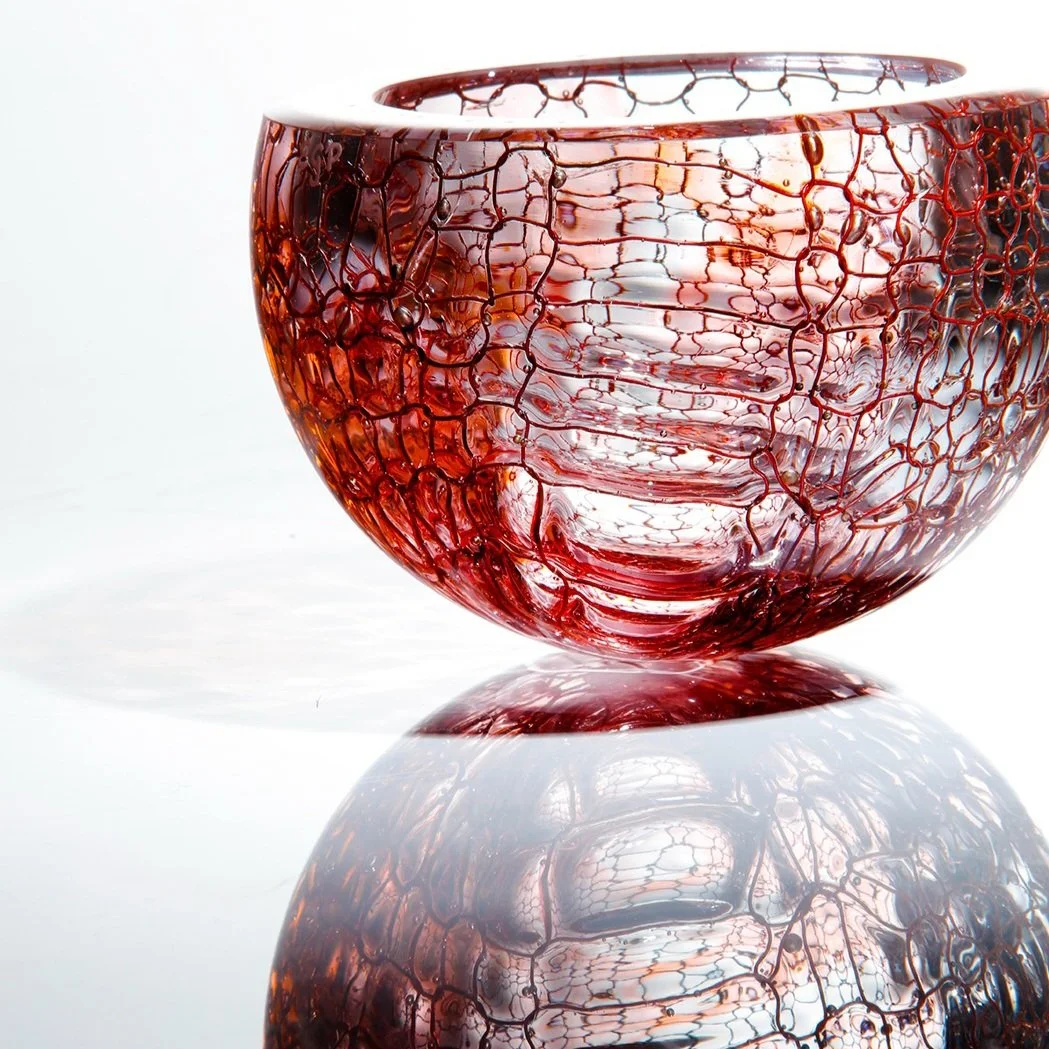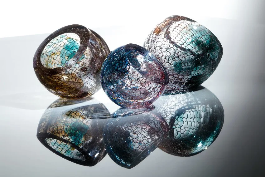 Glass maker Emmy Palmer won a scholarship with Teign Valley Glass while at college in 2006 and has continued a working relationship with them ever since. She graduated with a BA (Hons) in Applied Arts in 2007 specialising in glass. During her degree, she started to combine knitting with glass in different ways. She was taken by the combination of knitted metals with blown glass and has been refining the technique ever since.