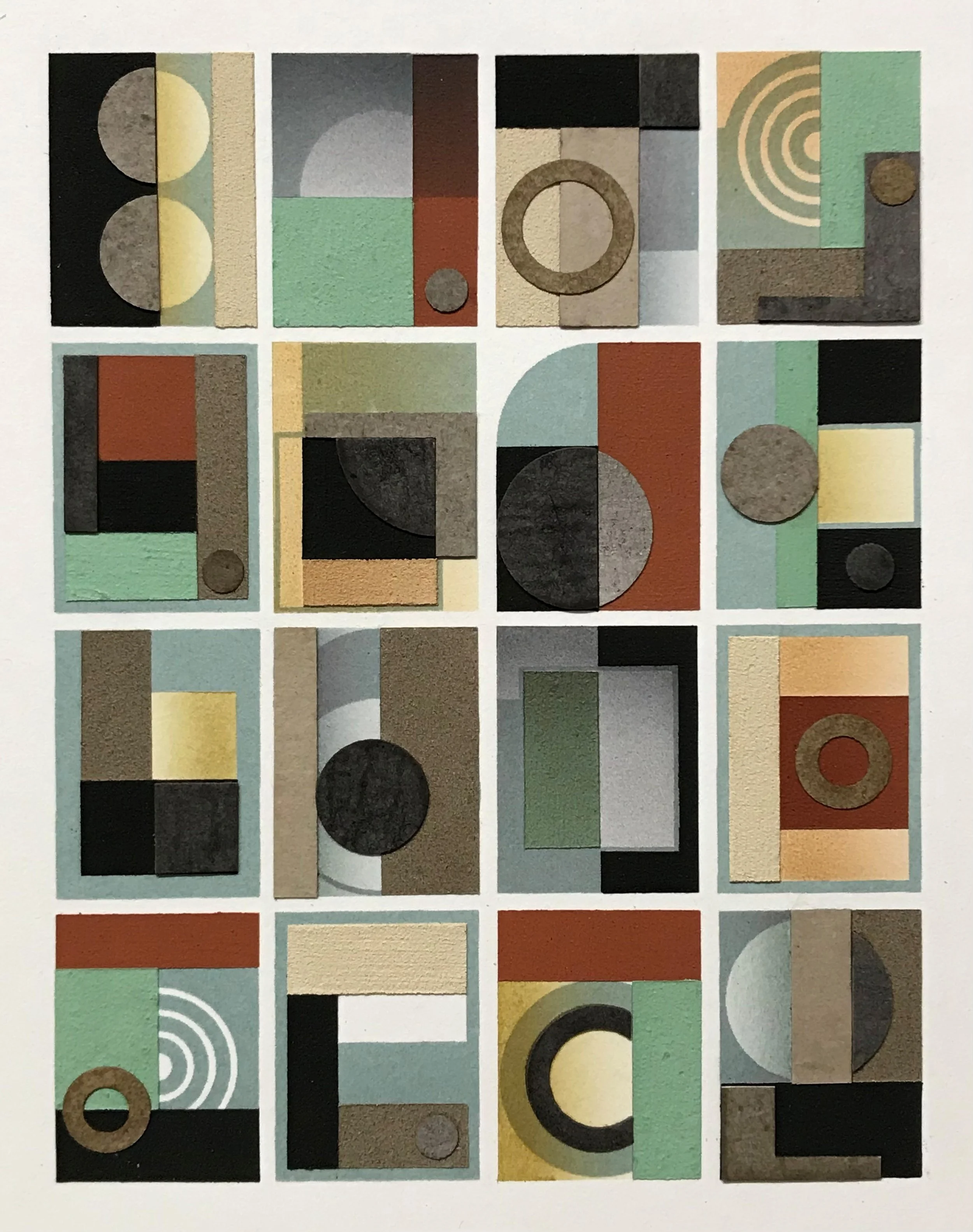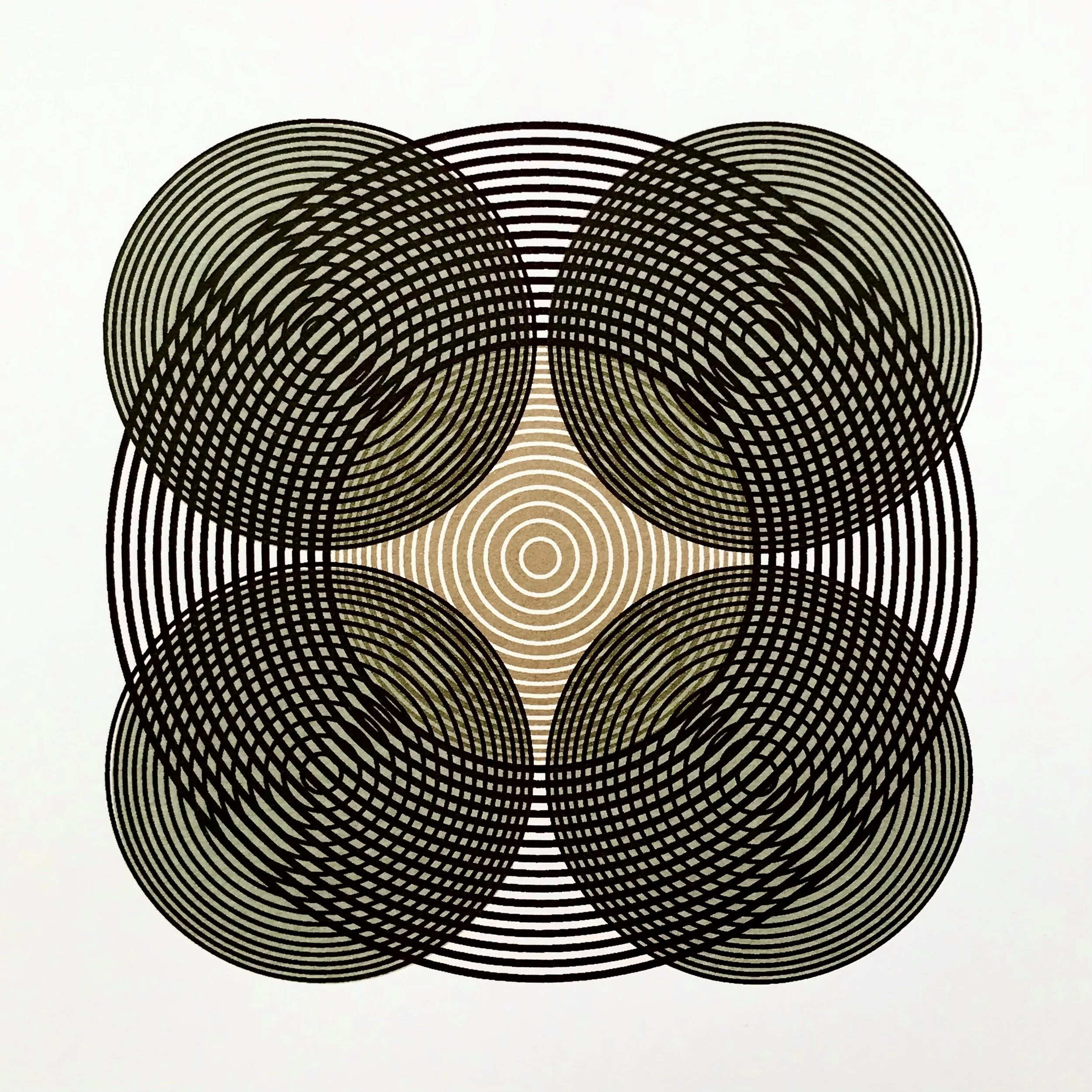 Tom’s work takes the form of small box works of screen-prints, paintings and collages, and larger abstract screen-prints relying on the overlay of contrasting lines to create unpredictable Moiré patterns.