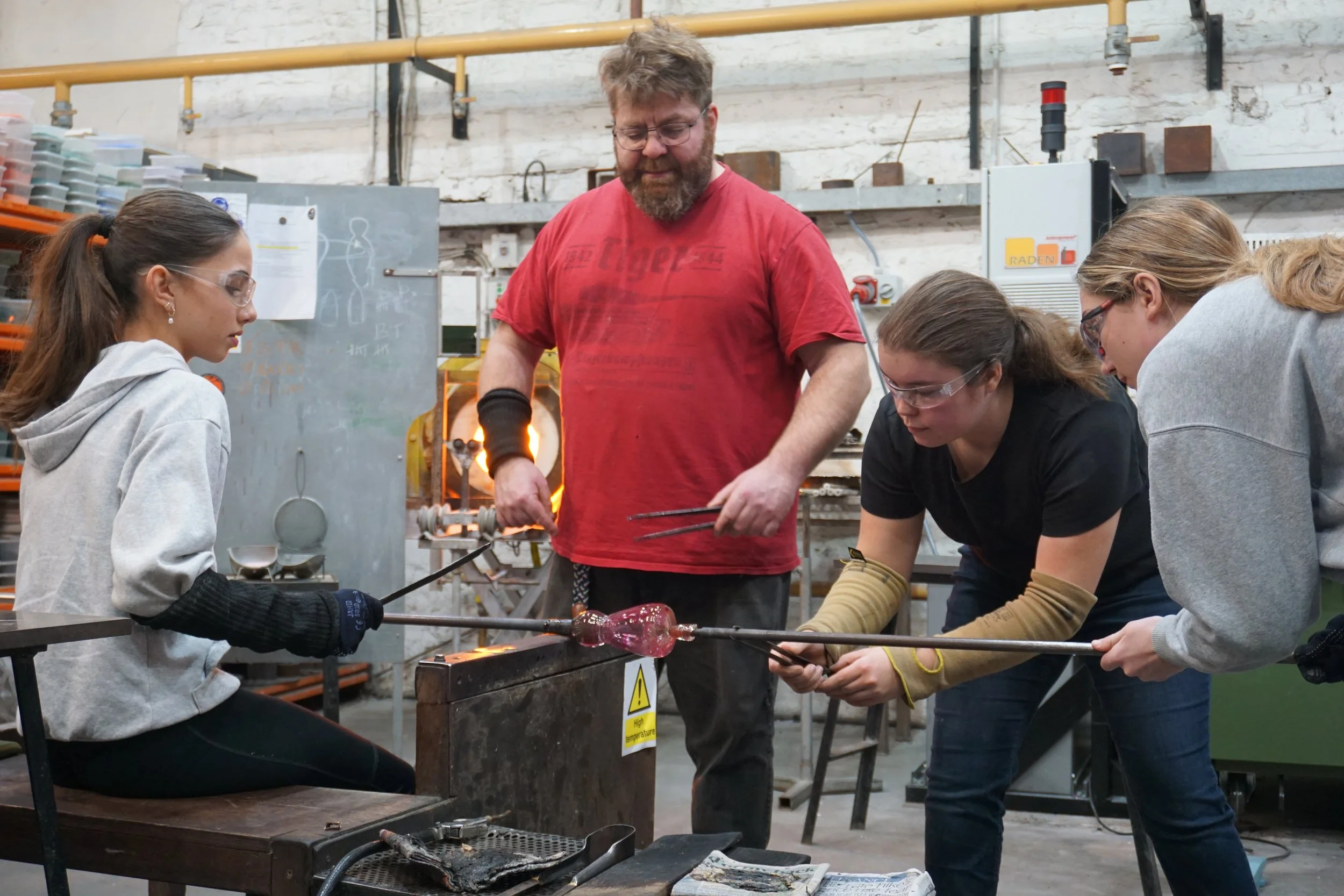 Emphasis is placed on giving our young people an experience of materials and processes that are rarely covered in secondary school curriculum. In previous years we have covered: printmaking, book-binding, paper marbling, ceramics, willow-weaving, traditional sign-writing, sculpture, letterpress printing, leather-working, embroidery, and glass-blowing.