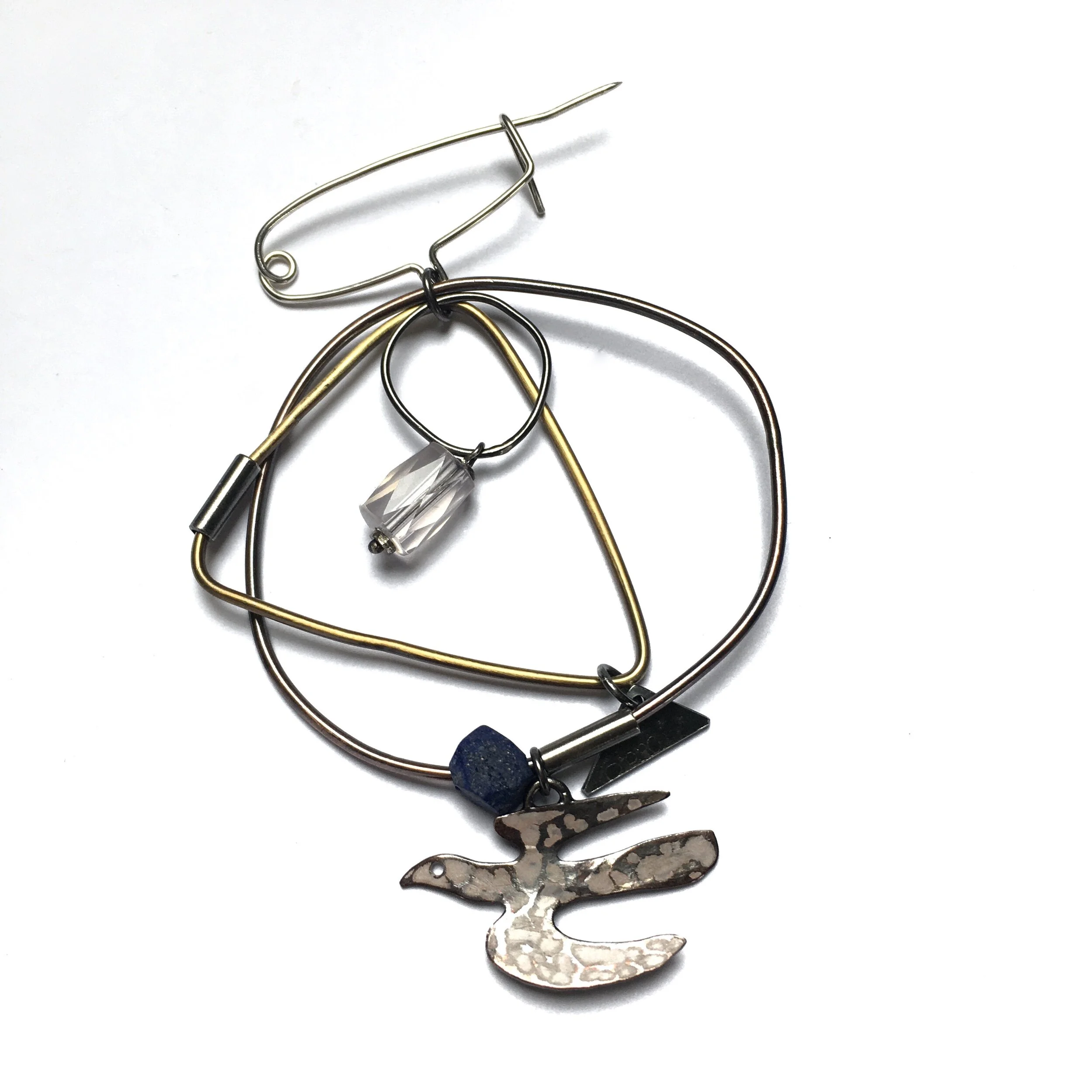 Silver, copper and brass wire brooch with rose quartz with patinated and hammered copper flying bird.
