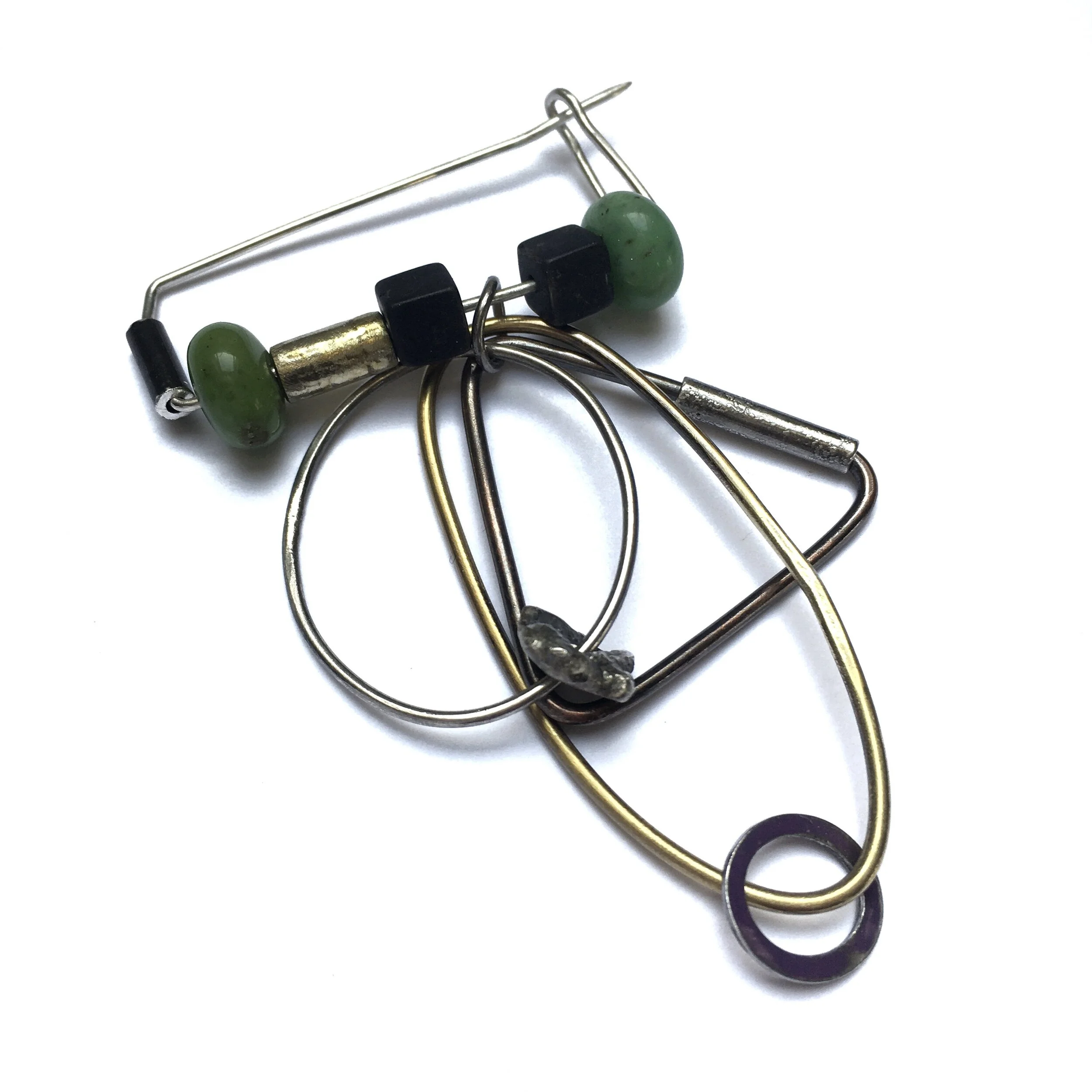 Silver, copper and brass wire brooch with onyx and chrysoprase beads and molten silver bead.