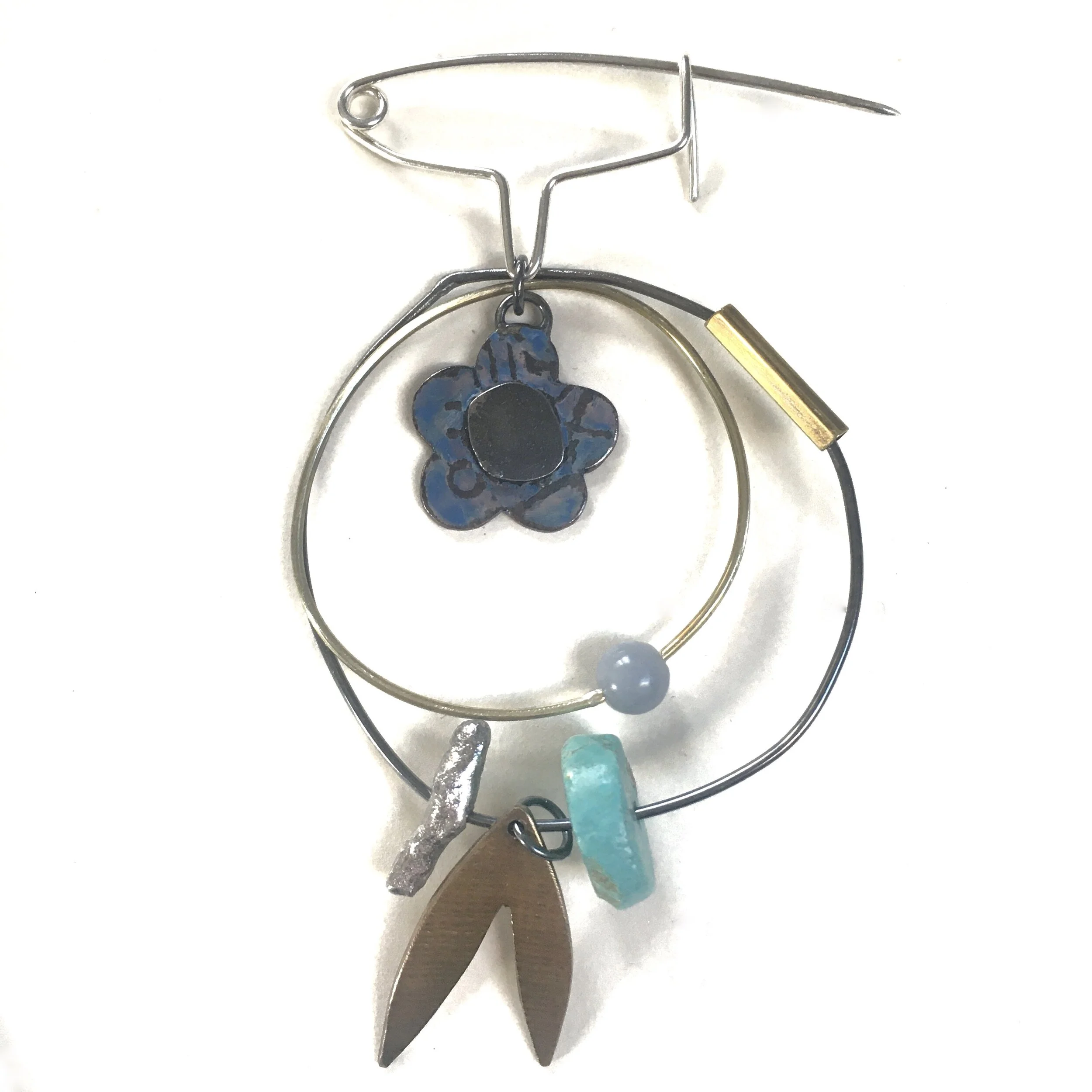 Silver and brass wire brooch with angelite, turquoise and molten silver beads with patinated and patterned copper and silver flower.