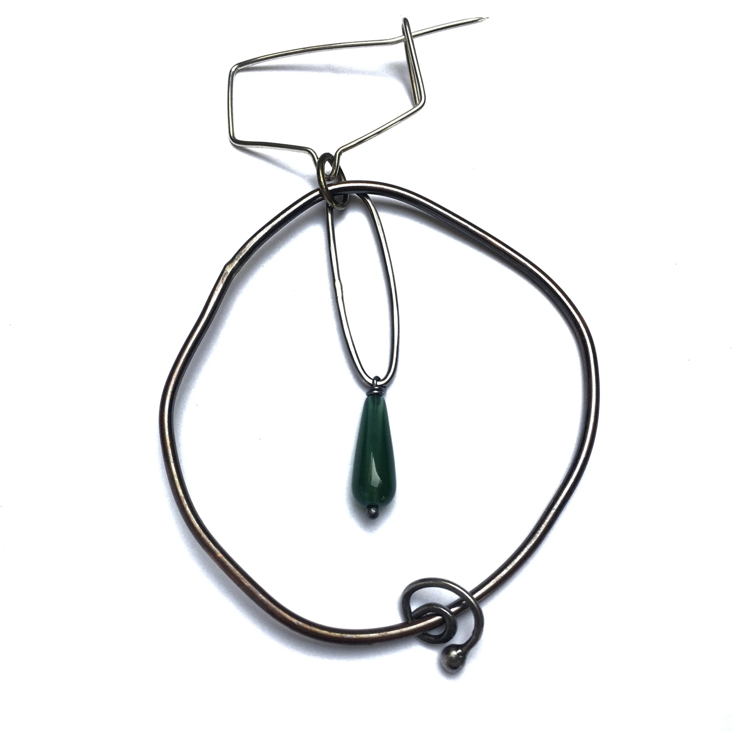 Copper and silver wire brooch with elegant green carnelian drop bead.