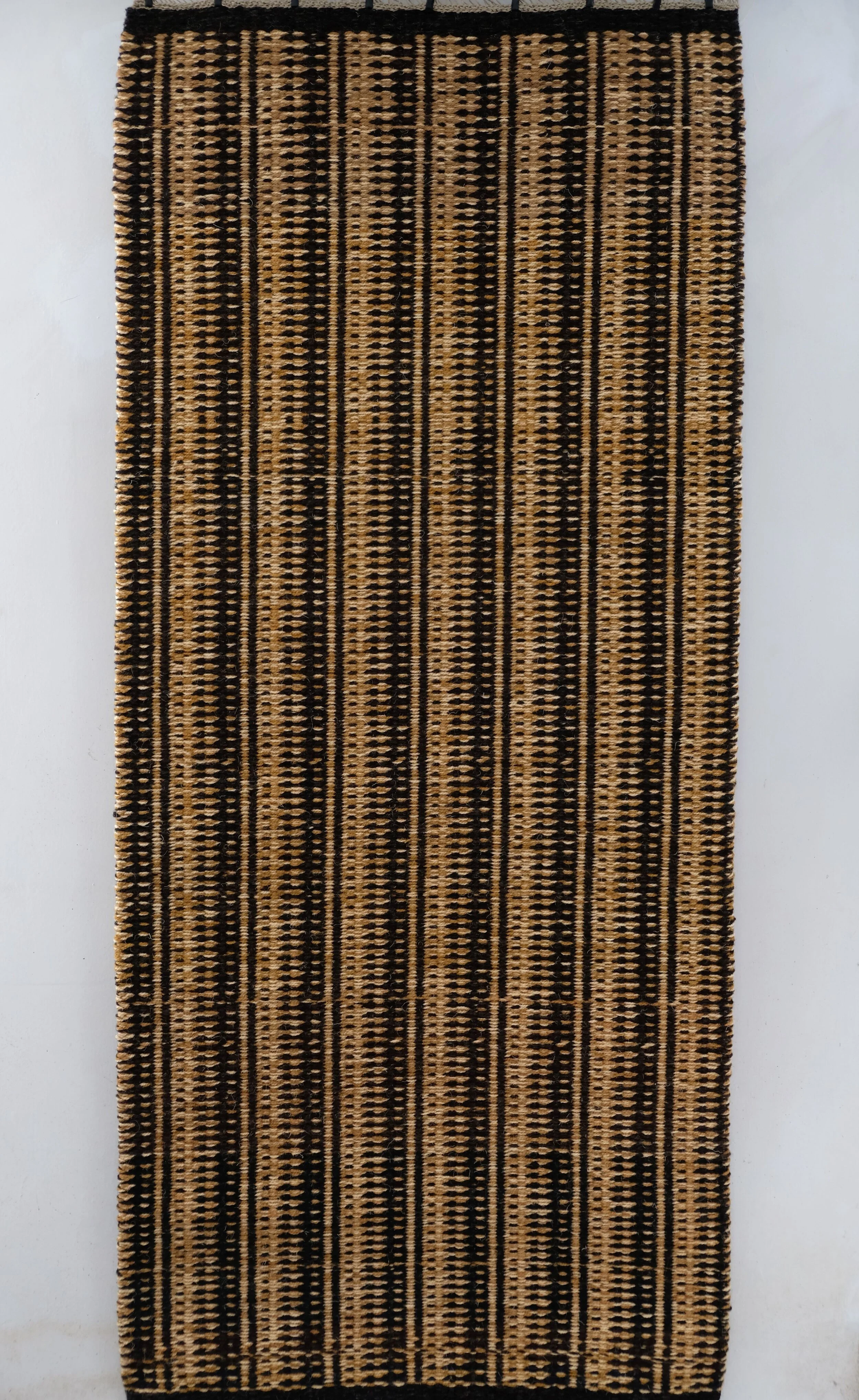 Thoughts of tigers have been around for some time, about 30 years. Translating tiger markings to loom woven pieces is tricky within the constraints of warp and weft. Tapestry or knotted pile would work, but are not my choice, rather to struggle against the odds. This is why few iterations have seen the light of day. This one has the colour, though far from the spirit of the creature. With a fair wind there will be more. There was a good leopard rug, so why not? Intention aside, what I make reveals itself only when off the loom, hence Armadillo scales.