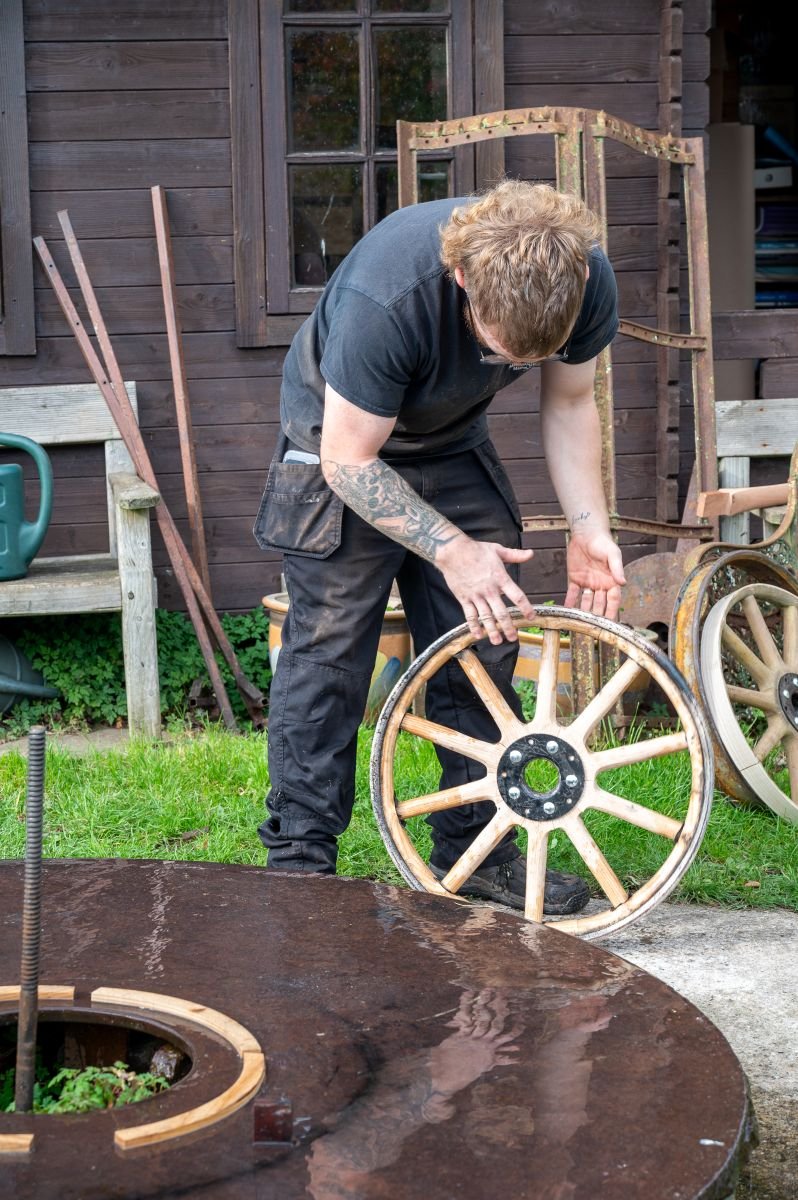 The moment of tyre fitting is central to the series. The iron rim is heated to expand, placed around the wheel, and then cooled so it contracts tightly into place. This process, both practical and visually dramatic, represents the point at which separate components become a single working object.