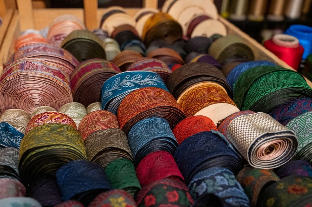 Thirty years on he is still exploring the wide possibilities of this very specialist craft and has produced much of the ribbon seen in films, TV productions, and reenactments, as well as on some of the best dressed men’s braces!